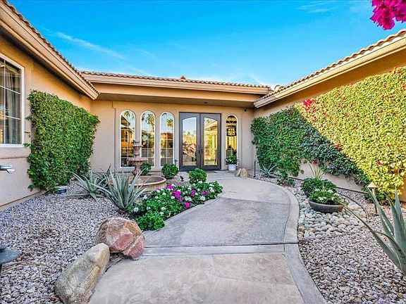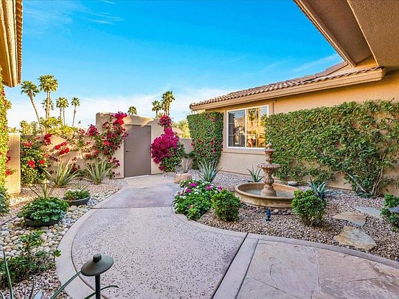 Welcome to this highly updated and customized Seville floor plan home in the Ventanas enclave of Rancho La Quinta Country Club. This truly exceptional property boasts 3 bedrooms and 2 and 1/2 baths with 2266 square feet of living space. The living/dining room features custom ceiling beams, remodeled fireplace with floor to ceiling stacked travertine and a new built-in dry bar with wine chiller. The custom ceiling beams are again featured in the kitchen/family room along with quartz countertops and new appliances (2021). The primary suite features sliders out to the rear patio. The attached en-suite bath has been upgraded with a new framed mirror and sconces along with a large closet with custom built-in cabinetry. There are 2 additional bedrooms and fully remodeled guest bath with custom tile features and quartz countertops. The entire interior and exterior were painted in 2021 along with all cabinetry being refinished and new hardware added. The South oriented backyard is a private oasis with a pool, spa, and outdoor fireplace, enhanced landscaping and lighting designed by Ray Martin Designs. Offered turnkey furnished with designer and custom furnishings/art, this home is the epitome of luxury and comfort. Ventanas residents enjoy low HOA dues and the option to purchase a sports or golf membership to the prestigious Rancho La Quinta Country Club, offering world-class amenities. This home perfectly blends privacy, elegance, and resort-style living.