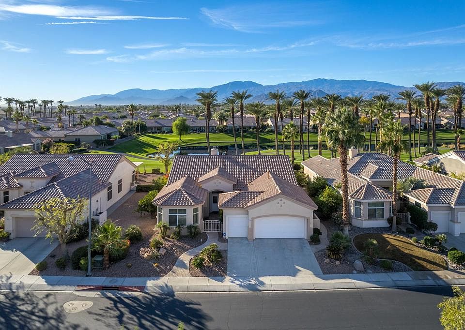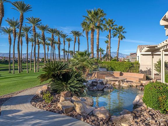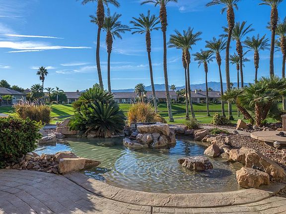 Sun City Palm Desert - Monterey. Located on one of the desirable locations in Sun City, this prized greatroom home sits above a tranquil greenbelt and lake. The south facing rear yard has an expansive stamped concrete patio with soothing water feature, built-in barbecue island & a gas/lava-rock fire pit. Panoramic views of the greenbelt and mountains can be seen from the rear yard as well as from inside the home. A gated front courtyard and leaded glass front door provides curb appeal. Inside, 10ft ceilings & transom windows provide abundant natural light. Shutters are on all but the greatroom view windows. The greatroom has custom cabinetry & a marble-trimmed gas fireplace. The kitchen has corian counters w/rounded edges, stainless appliances, and a breakfast bar. Raised-panel maple cabinetry is in the kitchen, laundry & bathrooms. The breakfast nook has a large bay window along w/a window seat that has built-in storage. The den/office has a custom built-in desk & shelving. The spacious primary suite has a slider to the rear patio & a huge walk-in closet w/built-in storage. The primary suite bathroom has dual sinks w/upgraded fixtures, an oversized spa tub & a large stall shower w/rimless glass doors; tile surfaces. The ample guest suite has a built-in desk. Its bathroom has a stall shower & tiles surfaces. The laundry room has a utility sink and plenty of room for storage. The 2+ golf cart garage has built-in storage. Furniture available outside of escrow.