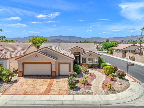 55+ Sun City Palm Desert--The ''Best Bang for your Buck'' active retirement community in the whole Coachella Valley. The St. Croix is the most popular model in Sun City as it has a separate golf cart garage. Spacious south-facing corner lot, gorgeous curb appeal, custom walkway with overlay and flagstone leading to the front door with glass inserts and transom window.Inside, 2 bedrooms, 2 baths, plantation shutters throughout, diagonally laid tile, engineered hardwood flooring (no carpet!) crown molding. The open and spacious kitchen has upgraded counters, breakfast nook with a view to the front with peek-a-boo mountain view, breakfast bar, chefs island, added cabinetry w/pull -out shelving. The great room is open to the dining and kitchen, built-ins with artistic niches. The master bedroom suite is spacious with added custom cabinets/built-ins, bay window. Bath is upgraded with newer counters, new shower with rainglass doors. Guest bedroom with adjacent upgraded bath. The DEN/OFFICE and HOBBY room is off the entry with a dual desk/bookshelf, and a versatile hobby/flex room with pocket door for extra privacy.. Laundry room has washer and dryer included and overhead cabinets.Extended 2-car garage plus golf cart, newer cabinets, custom Swisstrax flooring. Patio has overhang and is extended with an Alumawood awning, built-in BBQ, beautiful fountain perfect for relaxing and entertaining. ''Buy Where you Love to Play...Sun City Palm Desert!''