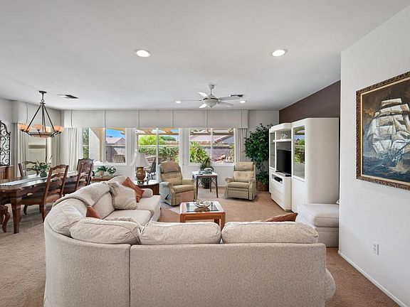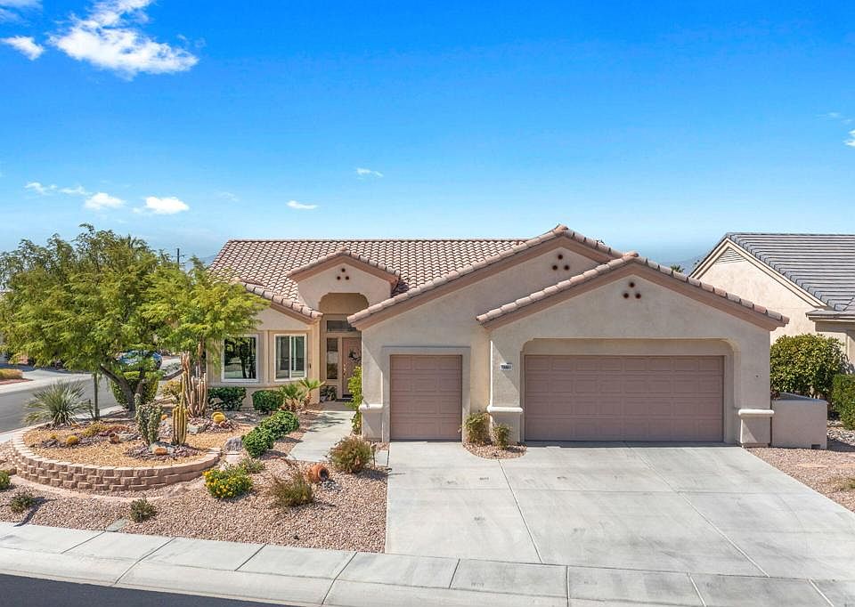 Comfortable, stress-free living starts in this spectacular St. Croix great room home with 2 bedrooms, 2 bathrooms, den, hobby room located on a corner lot in a cul-de-sac in Sun City Palm Desert. With all new Milgard windows (2020) and newer air conditioner (2017), this popular model is ready for you to move in. Relax in your private, south facing backyard with a covered patio, alumna wood extension across entire back of home, artificial turf and mature desert landscaping. Delightful, well-equipped kitchen features cozy breakfast nook near bay window with mountain views, upgraded corian counters, center island, stainless steel oven, extended cabinets with desk and drawers, pantry and breakfast bar. Light and bright great room with sliders to backyard. Den with murphy bed and double doors. Hobby room with built-in desk and shelves. Enjoy privacy in the spacious primary suite with plantation shutters, door to back patio, additional 5x20 foot closet with organizers in bedroom, bathroom with dual vanities, walk in closet and step in shower. Guest bedroom and bathroom down separate hallway. Inside laundry room with cabinets. 2 car plus golf cart garage with built-in storage. Recessed lights. Central vacuum. Newer irrigation. Sun City is a nationally renowned active adult community with golf courses, pools, tennis, pickle ball, bocce ball, softball, restaurants, social and activity clubs.