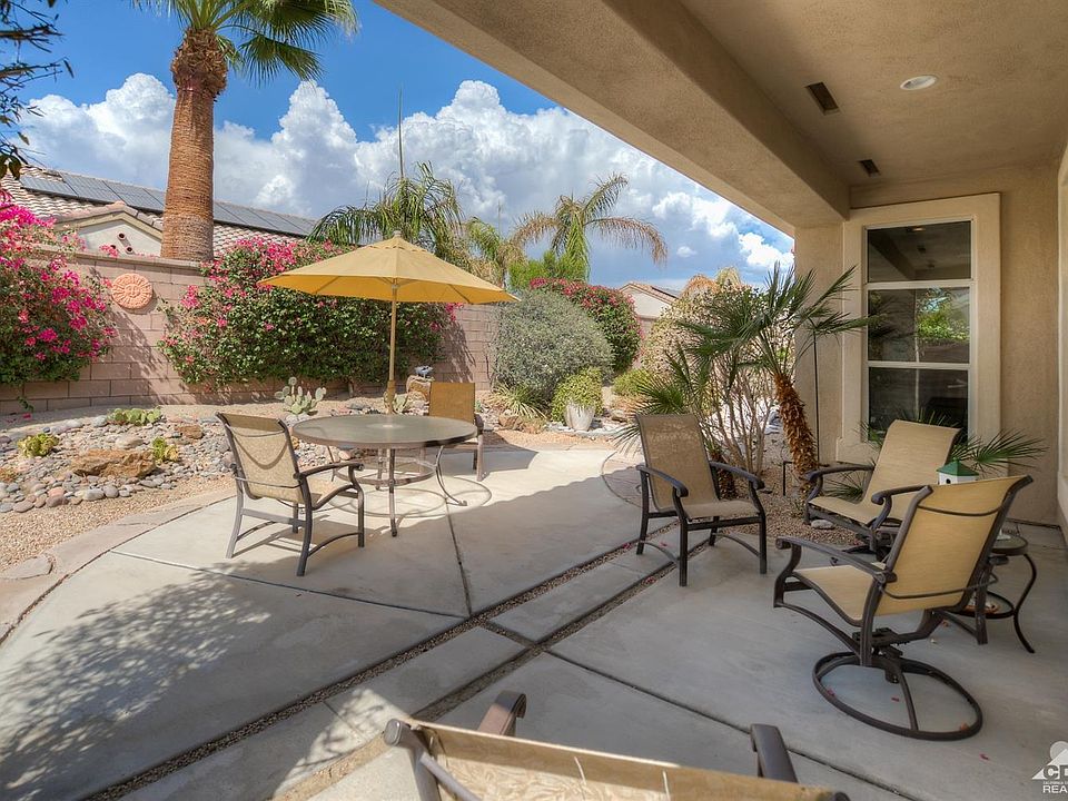 Sun City Palm Desert - Morocco. Located a short distance to the Sunset View clubhouse, this popular greatroom home sits on a corner w/a spacious north facing rear yard & lush desert landscaping. A gated courtyard w/large patio provides curb appeal & function. Inside, 10ft ceilings & transom windows provide a light & open environment. Diagonally laid tile is used extensively. A spacious den is off the greatroom. The eat-in kitchen has corian counters w/rounded edges, cabinets w/pullout shelves & bisque appliances including a wall oven & smooth glass cooktop (also plumbed for gas). Raised panel, maple cabinetry is in the kitchen, bathrooms & linen. Double doors lead to the master suite that has a bay window & large walkin closet. The master bath has dual sinks & a stall shower w/glass enclosure. A tub is in the guest bathroom. Bath surfaces are cultured marble. A utility sink is in the laundry room. The extended garage has a nook for golf cart parking & an evaporative cooler.
