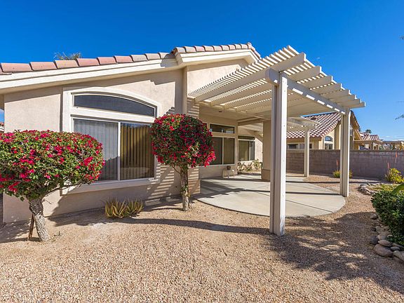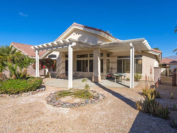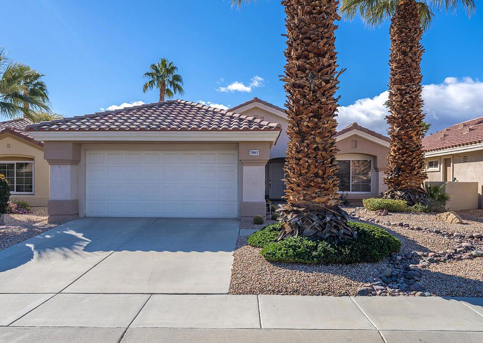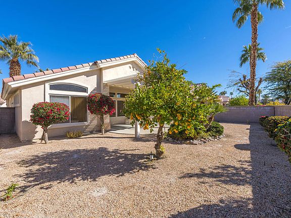 Sun City Palm Desert - Gorham. Located a short distance to the Mountain View Clubhouse, this lovely home has a spacious south facing rear yard with an extended patio, alumawood patio cover and low maintenance desert landscaping including citrus. Lush palm trees provide curb appeal. Inside, rounded hall entry ways, transom windows and vaulted ceilings provide abundant natural light. Vinyl flooring is in all but the bathrooms which have tile. The living room has a built-in media center. The kitchen has corian counters, a breakfast bar and a skylight. The primary suite has dual closets with mirrored wardrobe doors. The primary suite bathroom has duals sinks and a stall shower with textured glass doors. A tub/shower is in the guest bathroom. The washer, dryer, and refrigerator are less than 1 year old and is included. The 2 car garage has ample room for storage.