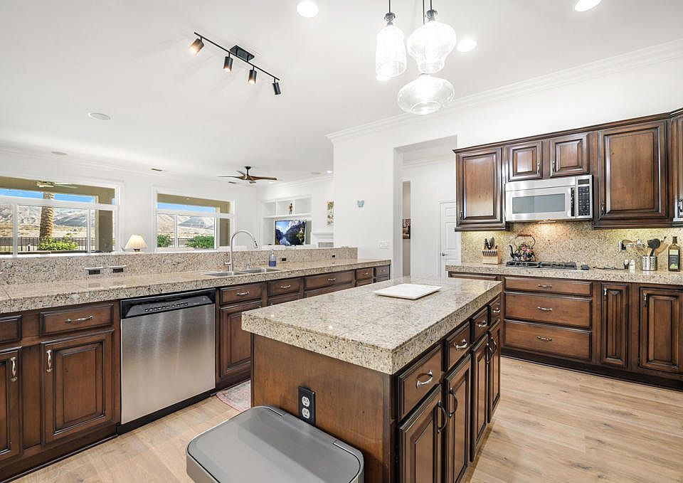 Experience the best of Del Webb's Sun City Palm Desert 55+ community in this stunning Victoria model, perfectly situated on the greenbelt just steps from the chipping range with breathtaking mountain views. Enter through the beautiful beveled glass doorway into a large foyer leading to a spacious living room with a fireplace. New hardwood floors throughout. This home offers an open floorplan that seamlessly connects the living spaces, ideal for entertaining or relaxing. The kitchen is a chef's dream, featuring dark wooden cabinets, sliding pull out shelves and drawers with plenty of storage, granite countertops, stainless steel appliances, and a convenient double oven. The primary bedroom is bathed in natural light from large windows, providing serene views of the outdoors. The primary bath is designed for comfort, with dual vanities, a soaking tub, a separate shower, and a spacious walk-in closet with built in drawers and shelving. With two bedrooms, two on suite baths, and a versatile den and guest bathroom, this home is as functional as it is elegant. Step outside to your private oasis, complete with misters and a refreshing saltwater pool and fountain overlooking the golf course. The newly planted fruit trees on the west side will grow to enhance your privacy.