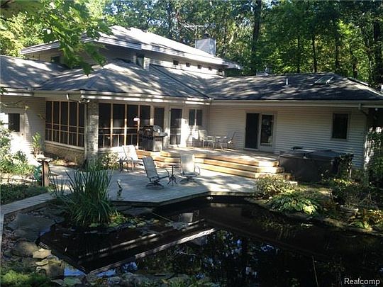 ENJOY YOUR OWN PRIVATE RETREAT ON WOODED ACREAGE BORDERING STATE LAND. BRIGHTON SCHOOLS AND EASY ACCESS TO TOWN. TRULY THE BEST OF BOTH WORLDS. ENTER THE 2 STORY FOYER LEADING TO A TERRIFIC OPEN FLOOR PLAN. LIBRARY WITH CROWN MOLDINGS, BUILT IN DESK. 2 STORY GREAT ROOM WITH FPL & VAULTED CEILINGS. FORMAL DINING RM. SPACIOUS KIT WITH GRANITE TOPS. APPLIANCES AND WALK-IN PANTRY. W/O TO 775 SQ FT DECK W/ HOT TUB OR TO 14x14 SCREEN PORCH OVERLOOKING SERENE POND & WATER FEATURES. FIRST FLOOR MASTER SUITE HAS FIREPLACE, TRAY CEILING, W/O TO DECK. DOUBLE VANITY, SPA TUB, WIC. 2ND FLOOR HAS OPEN WALKWAY AND A LARGE FULL BATH W/SKYLIGHTS. FINISHED W/O LL HAS 4TH BDRM, FULL BATH W/STEAM SHOWER, FAMILY ROOM W/WET BAR, WORKSHOP, WORKOUT ROOM (COULD BE 5TH BDRM). 3 CAR GARAGE AND PORTE-COCHERE FOR INCLEMENT WEATHER ENTRY. NATURAL GAS AT ROAD. 2X6 CONSTRUCTION. 3' ROOF OVERHANGS. ANDERSON WINDOWS. WHITE OAK DOORS & TRIM. ALSO AVAILABLE ON 4.25 ACRES SEE MLS #214100649.