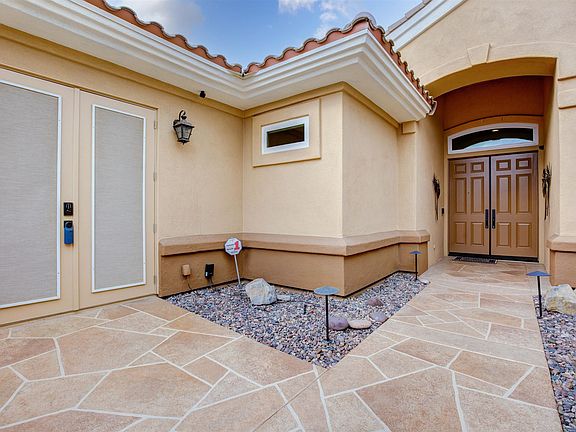 Sun City Palm Desert - Extended Monaco w/breath taking views nestled behind the 3rd Santa Rosa green looking down two fairways to the Shadow Mountains. Desert landscaping w/gated courtyard and double door entry. Quality fine touches abound. travertine tile is in all but the living room & Guest Rm; 12-ft living room ceilings w/recessed art lighting; custom built-in media center in family room. Exquisite slab granite kitchen counters, long chef's island w/breakfast bar, pendant lighting, stainless steel appliances, induction cooktop and cabinets w/pullout shelves. All 3 bathrooms have beautiful granite counters, and showers w/frameless glass. Extended guest suite is set up as a media room w/built-in media center, cork flooring, Hunter Douglas blinds over shutters, microwave, refrigerator and double French doors. Office has built-in custom desk w/storage. 2-car plus golf cart garage. NEW windows throughout, repainted home exterior, new front door; Restora resurfaced driveway/entry/rear patio; resurfaced garage floor w/epoxy, repainted garage walls, doors and cabinets; Hunter Douglas motorized blinds, ductless mini split AC/heat in 3 bedrooms plus family room, mini A/C split in garage, security doorbell/cameras, security door locks. Active Adult Community. Come enjoy the resort lifestyle that this resort community has to offer.