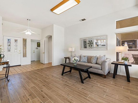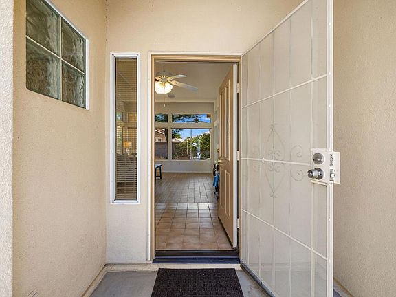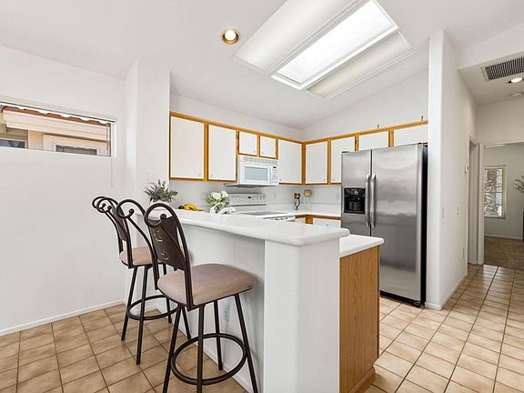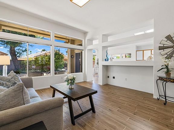 Located in the best 55+ community in the valley, Sun City Palm Desert, This Gorham model is one of the favorites. It has 2 bedrooms, 2 bathrooms, and a small office/flex room. The bedrooms are on separate sides of the home for privacy and comfort. The exterior was painted recently in a new desert color scheme, and the interior has new carpet and paint. The kitchen is open to the living room and dining room, and it has a skylight and a peninsula bar. The primary bedroom, living room, and kitchen view the large south-facing backyard, with a peekaboo mountain view. It has a covered concrete patio with plenty of shade. The yard is large enough for a pool and is a great entertaining space. The primary bedroom has a nice view of the yard, and the bathroom has a double vanity, a walk-in shower, 2 closets, and a skylight. The 2 car garage is roomy and has a side door to the yard.