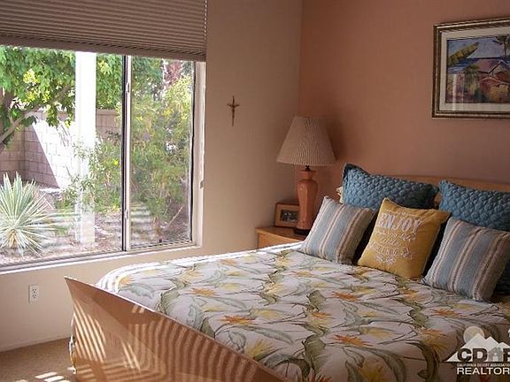 Seldom on the market Jensen model. Two bedroom, two bath plus den/office. Upgrades throughout this 1695 square foot Sun City/Palm Desert home. Carpet, wood and tile flooring. Vaulted ceilings and plantation shutters among the many highlights that set this home apart from the rest. South facing covered patio with extended deck top off this low maintenance, desert landscaped yard. Newer A/C and water heater. Two car garage with ample storage areas. Sun City/Palm Desert is an active 55+ community with 80 chartered clubs, two golf courses 10 lighted tennis courts and much, much more. If you get bored here it's your own fault!