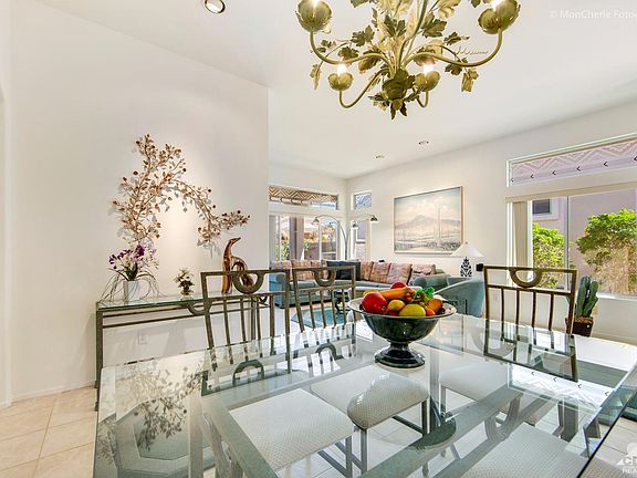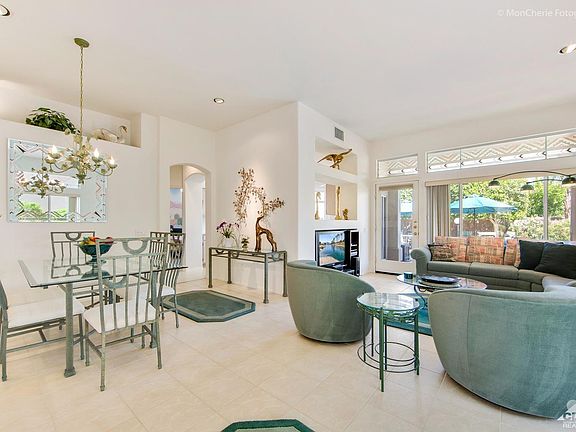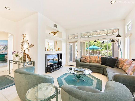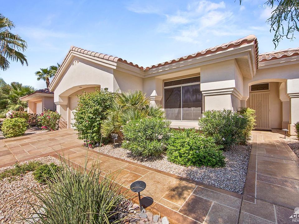 This welcoming move-in ready furnished home is a highly desirable Christofle model. Enter into a very open living room that opens to the lush backyard. The living room has soft can lights. The master ensuite has double sinks, a walk in closet and views of the back yard. The second bath has a Safe Step Walk In Tub. The kitchen includes its own eating area in addition to the formal dining room that is open to the living room. The fans in both bedrooms and kitchen area help keep the A/C bills low. It also has custom Corian counter tops. The entire home has tile and laminate flooring. The concrete driveway and rear patio have just been resurfaced. All of the furniture, art, TVs, stereo and statues you see are included in the sale! You will not only get a very comfortable home you will enjoy the Sun City Palm Desert lifestyle. The Mountain View Recreational center is near by. It has 2 pools and spas, a restaurant, a post office and much more. Your new home looks forward to meeting you