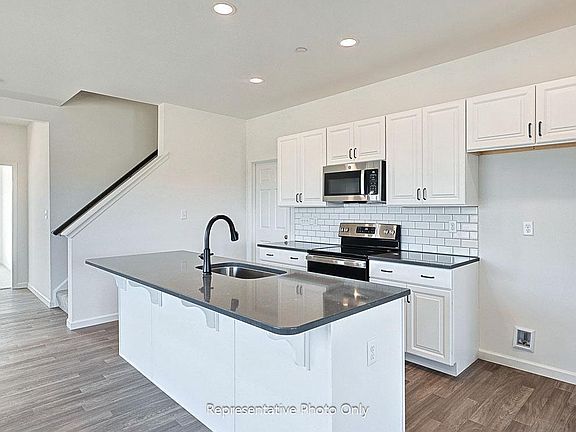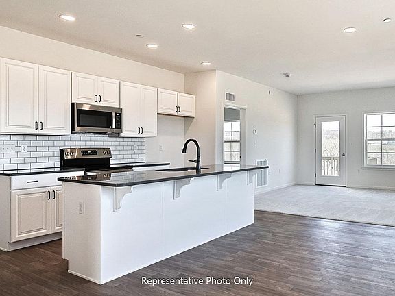 This 2-story, end-of-row townhome includes a first-floor owner’s suite, 2-car garage, and a versatile flex space to the front of the home. The family room, with an ample amount of natural light, opens to the rear deck. The kitchen is well-appointed with stainless steel appliances, quartz countertops with a tile backsplash, and a large center island that opens to the dining area. The owner’s suite, tucked quietly to the back of the home, features an expansive closet and a private bathroom. On the 2nd floor is a generous loft space, two additional bedrooms, and a full bathroom.