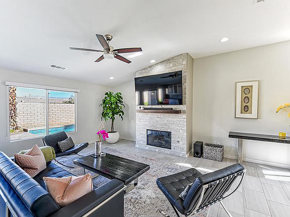 A beautiful, nicely maintained home built on a 8,712 SF (est.) lot in a gated community! This incredible home is tucked away in a quiet Cul-De-Sac, so the setting is serene and the traffic is minimal. There are 3 bedrooms, 3 baths, a full-size 2 car garage with plenty of storage space, and a spacious backyard with a pool! The functional floor plan is ideal for entertaining, with the huge kitchen overlooking the open great room. The kitchen features stainless steel appliances, stunning Quartz countertops, and a modern waterfall island. There is tile throughout the home, except for the bedrooms, which all have plush carpet. You will love the spacious master suite with dual vanities, a large oval tub, and a perfectly placed window that invites in the gorgeous natural sunlight! The kitchen and primary room recently had new sliding doors put in. This spotless home has been beautifully upgraded and is move-in ready in an ideal location! Several golf courses are nearby, and the Indian Wells Tennis Gardens is just minutes away.