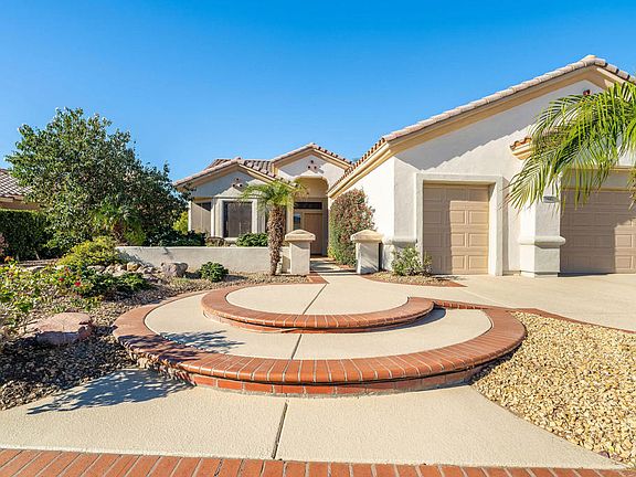 GORGEOUS GOLF COURSE, LAKE & MOUNTIAN VIEWS. Located in the beautiful 55 plus Del Webb Sun City Community on the 17th hole of the San Gorgonio course. This St Croix model is complete with 2 bedrooms, 2 baths, den & office with lots of beautiful upgrades. The stunning, large eat in kitchen has new granite, beautiful backsplash & newer appliances with a breakfast bar. With an open floor plan the living room has built in shelves & great views out to the golf course & lake. The primary bedroom is expansive with a door out to the patio & the bathroom suite is nicely upgraded. The office space includes built in shelves & desk with beautiful brazilian koa wood floors extended out into the den. Newer tile floors throughout the rest of the home, with carpet in the bedrooms. The laundry room includes sink & cabinets, 2 car garage with golf cart garage with new garage doors. Newer A/C, water softening system. Exterior of homes has new brick inlay & cool concrete added recently. Home is equipped with speakers through out the home, patio & garage. Fruit trees & water feature in front of the home along with a front patio to sip your morning coffee & enjoy watching the sunrise. This home has all you need within a community filled with amenities.
