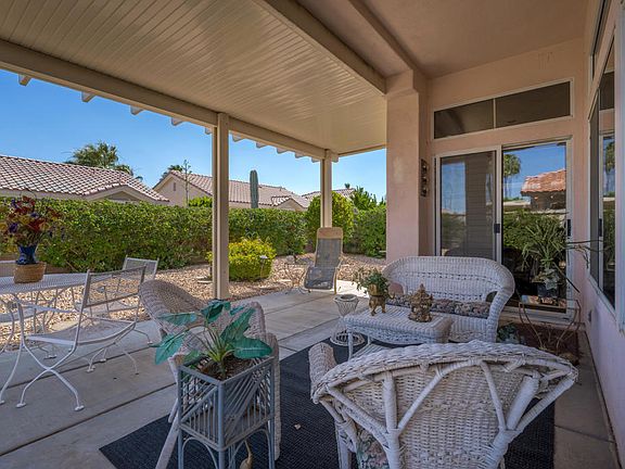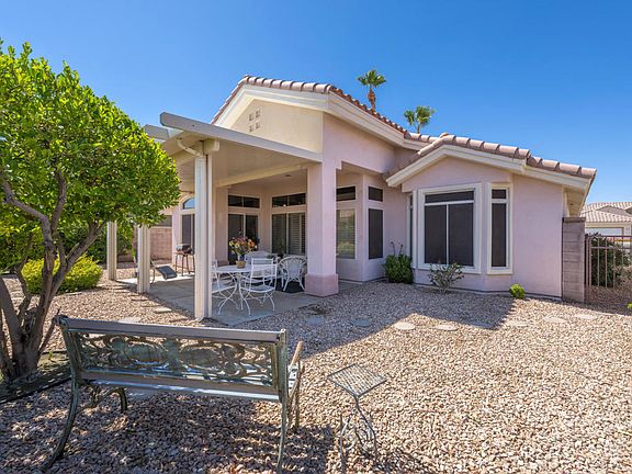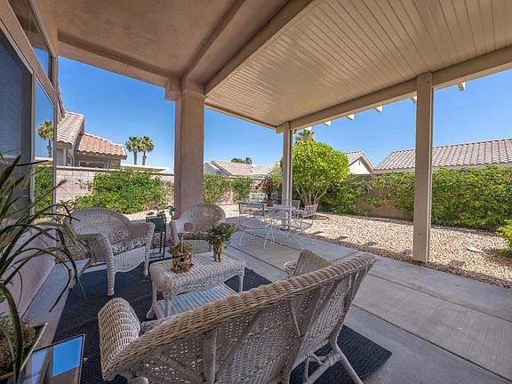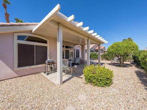 Sun City Palm Desert - Gorham. Located a short distance to the Mountain View Clubhouse, this home has a spacious south facing rear yard with an extended patio , alumawood patio cover and desert landscaping including citrus. Tall palm trees and well-maintained landscaping provide curb appeal. Inside, shutters are on most windows. Tile flooring is used extensively. The living room has a custom media center and shelving. The kitchen and dining area share a vaulted ceiling. The kitchen has a breakfast bar, skylight and corian counters. The primary suite has a vaulted ceiling and dual closet with mirrored wardrobe doors. The primary suite bathroom has a stall shower and duals sinks; cultured marble surfaces. The guest bathroom has a tub/shower. The guest bedroom has a closet with mirrored wardrobe doors. The laundry room sits between the main hallway and garage. The 2-car garage has built-in storage