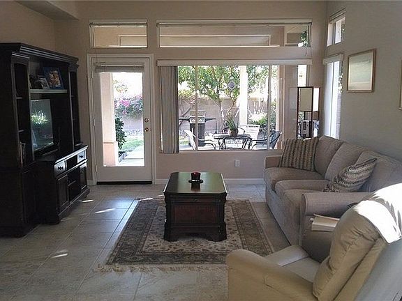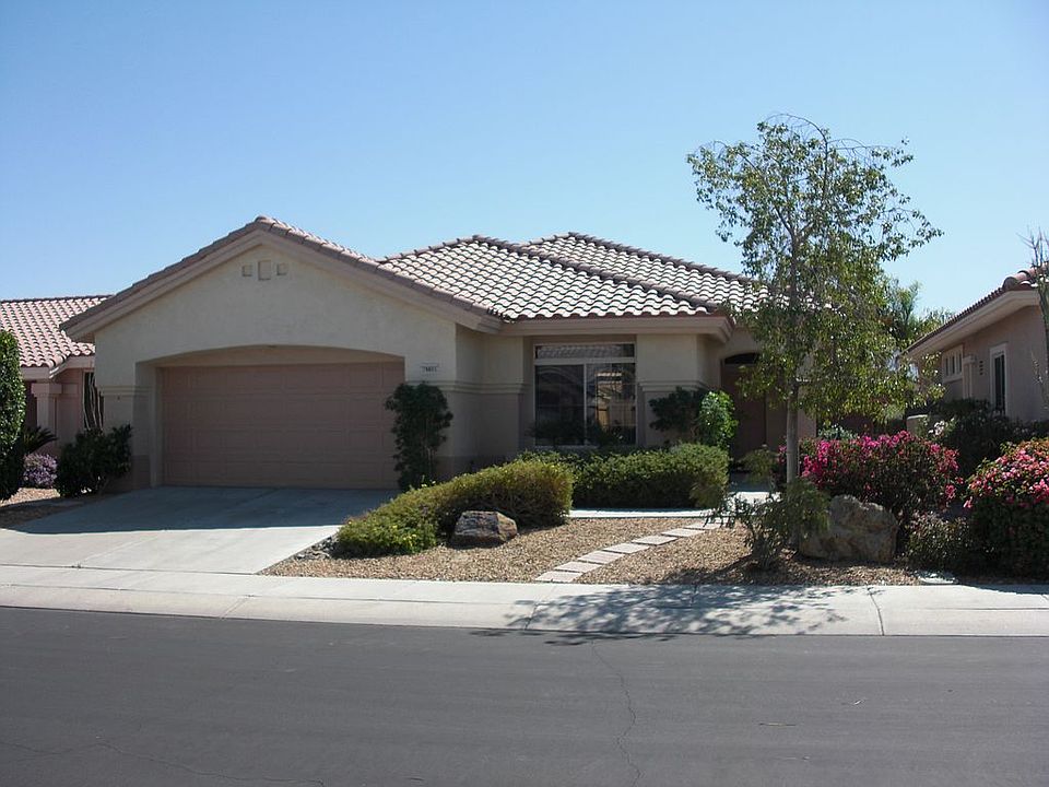 55+ Sun City Palm Desert. SOUTH facing 2 bed/2 bath Christofle model in great location... just a short golf cart ride to main Mountain View Clubhouse offering tennis, pickleball, post office, etc. This home provides a well-designed layout with plenty of open living space, good separation of bedrooms, and lots of storage....perfect for your wonderful forever home or vacation home. Inside, home has beautiful architectural details, is bright and cheery with transom windows, updated in 2013 with desert-tone paint, 18x18 tile t/o in 2013, A/C & furnace, Bosch D/W in 2017 & hot water heater. Spacious living room, dining area, kitchen and breakfast nook have views and access to private patio. The south facing warm and sunny rear patio w/ artificial turf, and an extended Alumawood awning perfect for entertaining all year round. Master bedroom has bay window, seat and storage, walk-in closet, bath has double vanity and large shower. Guest bathroom has soaking tub/shower. Indoor laundry room w/ cabinets & storage with washer and dryer dryer included. 2 car garage has cabinets and and storage. Low maintenance landscaping. Move right in and enjoy our beautiful, safe, serene, active community. Buyer to verify sq. ft.