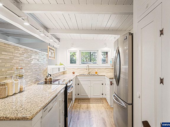 Updated & immaculately cared for Mid-Century Modern 1966 single story home on 1/4 acre corner lot. Original real wood flrs, fresh interior paint, updated kitchen w/ slab granite counters, tile backsplash, updated lighting & appliances. Numerous New Anderson windows. Vaulted wood beamed ceiling throughout, 2 fireplaces, mudrm/utility rm, mature landscaping, private backyard. Large attached garage/shop. Room for 3 vehicles to park on paved portion, extra parking for RV on gravel area. This home is a must see!