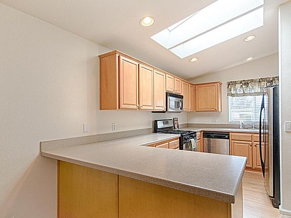 10 years new home in all age park w/swimming pool, clubhouse & beautiful pond adjacent to the 183 acre Pinto Lake County Park. Open floor plan layout w/spacious kitchen w/ample counter & cabinet storage, eat in breakfast bar & dining area opens to living room. Vaulted ceilings, skylights, recessed lights & overhead fans throughout. Side entrance w/laundry area off tandem covered parking. Large storage shed is included & small yard in back with room to garden or create a place to relax & enjoy the outdoors.
