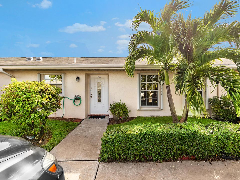 Come see this charming 2 bedroom 2 bath beautiful unit with wonderful private backyard. Shows well and is truly a move-in turnkey unit! Tile floors through out. Spacious kitchen with SS appliances and granite counter tops, updated electrical panel, Washer & Dryer inside unit. Enclosed patio. Accordion storm shutters on all windows.Fresh paint. Covered Bridge is a delightful, active 55+ community featuring 2 heated pools, shuffleboard, bocce and lighted tennis courts. Community offers many amenities including clubhouse with fully equipped exercise room, a well stocked library and a billiard room, and walking paths. Well maintained grounds and gorgeous Lakes throughout the community. HOA includes Water & Cable. One pet allowed.