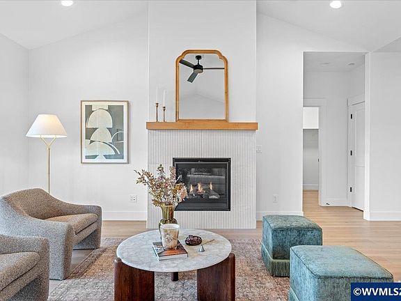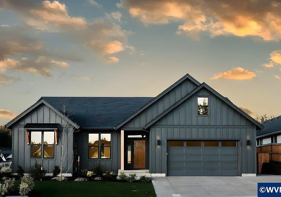 New single-story Modern Northwest home with warm natural finishes and a backdrop of open space. Clean exterior lines with natural wood and metal accents, landscaped grounds, and a fenced backyard. Interior offers warm wood shaker lower cabinets with brass hardware, quartz slab countertops, brass hammered pendant lighting, a butler pantry, and a flexible range setup for gas or electric (gas range included). The living room features a fluted stone style fireplace, vaulted ceilings, and large sliding doors opening to a covered patio with built-in ambiance lighting. The spa-inspired primary suite showcases a floor-to-ceiling glass waterfall shower with a vertical wood-tone fluted wall, soaking tub, and dual sinks. Short walk to the community park. Bonus parking, home fire sprinkler system, and a 1-year builder’s warranty included.