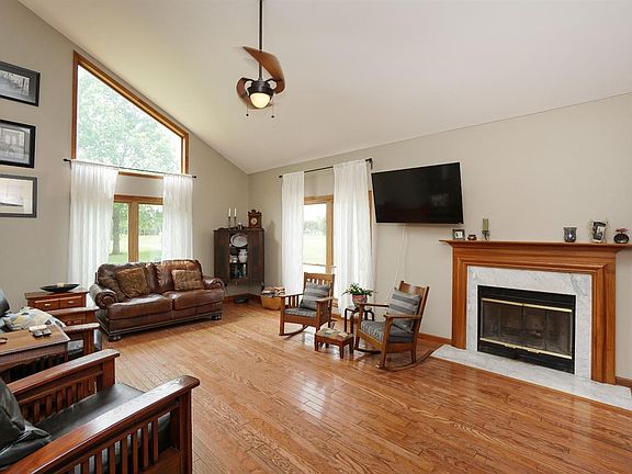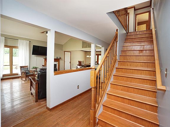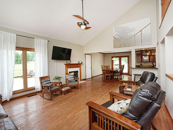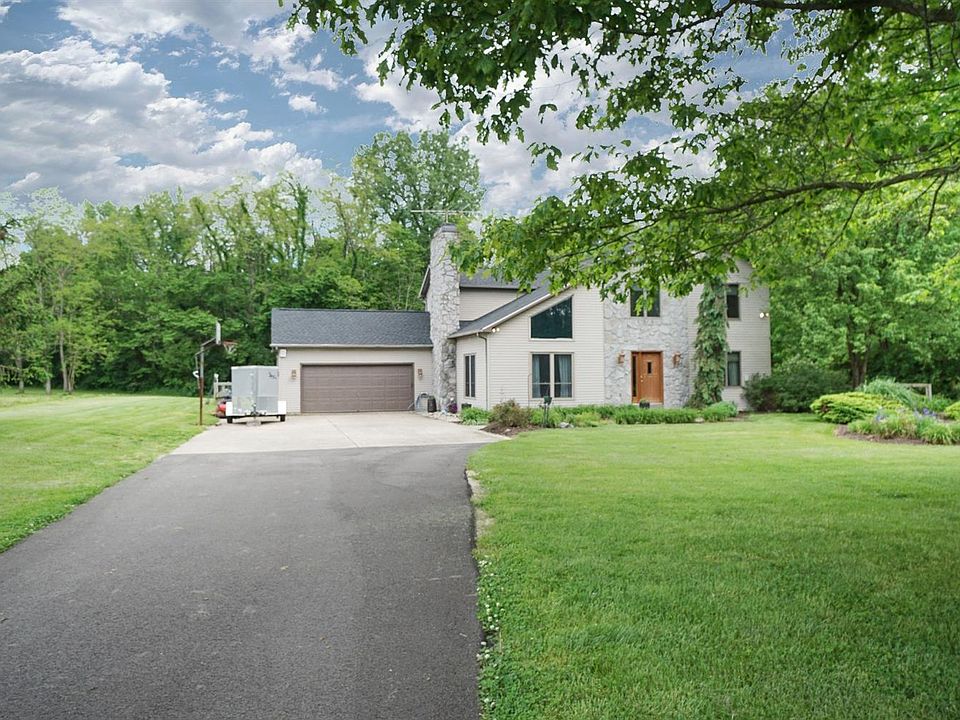 Feels like you are on a vacation getaway, stone exterior, mature trees & koi pond. Living rm w/ vaulted ceiling open to loft & fireplace. Updated kitchen, Amish cabinets, granite & barn door pantry. Deck & pool are just outside back door. 2 beds each w/ bath & loft/office upstairs. Finished walk out basement w/ bath & 4th bdr. Good Well!