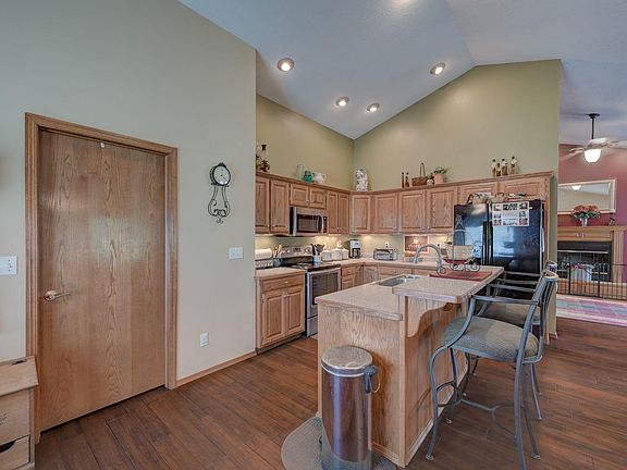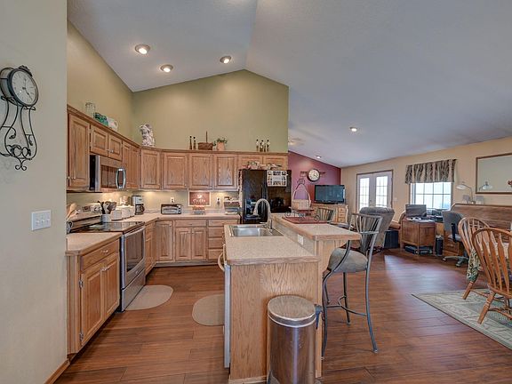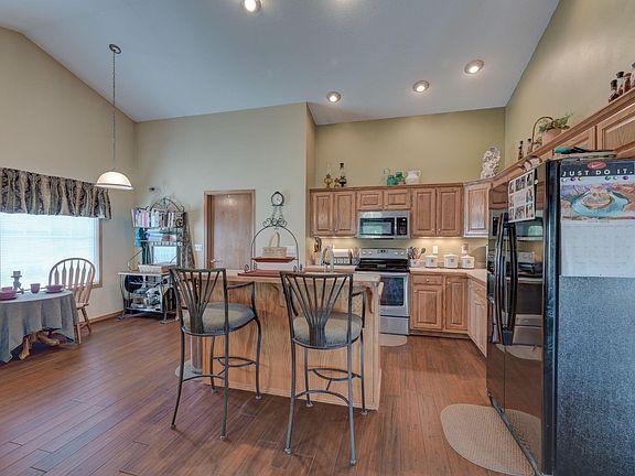 Enjoy your morning coffee with a breathtaking view of the pond to the east of the property! Open floor plan with soaring ceilings and wood-burning fireplace to greet you in the living room. The huge dining & kitchen area has an eat-at bar plus plenty of room for your harvest table & heirloom hutch. The master bedroom and 2 additional bedrooms grace the main floor. In the finished walkout basement, you will find an enormous family room with an entertainment center, pellet stove, concrete-topped bar with mini-fridge and separate wet bar. The galvanized tin ceiling, rustic wood walls, & painted concrete floors make this a fun, cozy area for entertaining. The downstairs bathroom has a vintage claw tub & ceramic plank floor. The downstairs garage has heat & air. Legal Desc: Lot 5