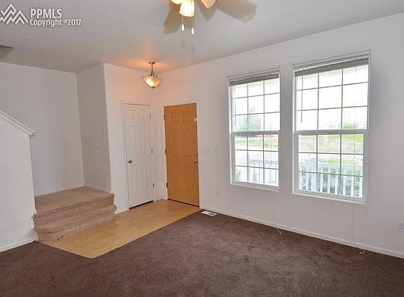 Spacious townhouse featuring 2 bedrooms, 1.5 baths, living/dining room, kitchen with cute eat-in breakfast nook. Nice and bright with 9 ft. ceilings on the main floor, new hardwood floors in the living room and paint. Kitchen has black appliances, a pantry and back door leading to a quiet area overlooking open space and walking/jogging trail. Laundry closet is upstairs between the bedrooms, there is a 4 foot crawl-space for storage. Close to shopping, restaurants, military bases and recreation. Perfect for owner occupants or investor. Close to Fort Carson, Peterson and Shriver AFB