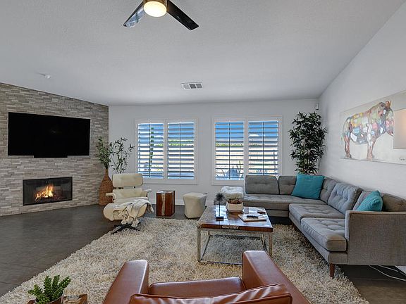 Discover a gem in North La Quinta within the gated community of Starlight Dunes. This stunning home is perched on a premium corner lot at the end of a tranquil cul-de-sac. Step inside to find a beautifully remodeled space with a modern touch. The open floor plan is highlighted by a striking stack stone fireplace and updated flooring throughout. The gourmet kitchen is a chef's dream, featuring custom cabinets, stainless steel appliances, granite slab counters, a unique backsplash, breakfast bar, pantry, and custom lighting. The luxurious master suite offers a Carrera stone shower, spa tub, dual vanities, a walk-in closet with built-ins, and a slider that opens to the sizeable pool area. Additional features include shutters, updated baseboards, recessed and pendant lighting, ceiling fans, and desert landscaping. But that's just the inside! Step outside to a spacious patio and private backyard with a large pool and raised spa, all framed by breathtaking mountain views and sunshine! No shortage of space for friends and family to enjoy.