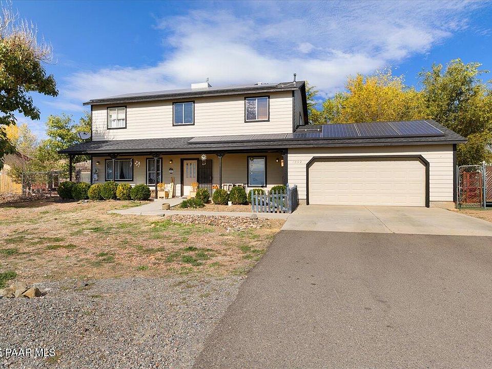 Discover this inviting two-story home in the heart of Prescott Valley offering 2,160 sq. ft. of living space with 4 bedrooms and 3 bathrooms. Designed for both comfort and entertainment, this residence combines modern convenience with scenic charm. Spacious family room perfect for gatherings and relaxation. Dedicated game/rec room ideal for entertainment, hobbies, or a home theater setup. Open-concept kitchen and dining area with ample cabinetry and natural light. Primary suite with private bath and generous closet space plus three additional bedrooms offering flexibility for guests, office, or playroom. Fenced backyard with a cozy fire pit, perfect for evenings under the Arizona sky. Beautiful views of the surrounding Prescott Valley landscape from multiple vantage points. Attached 2 car garage and plenty of storage throughout. This home is the perfect blend of functionality and lifestyle, offering space for family living, recreation, and outdoor enjoyment complete with chicken coop! With its prime location, you'll be close to schools, shopping, and all the amenities Prescott Valley has to offer. Leased solar saves your power bill! 4 yr old roof for added peace mind!