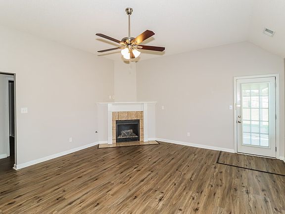 This gorgeous Olive Branch, MS rental home has three bedrooms and two bathrooms along with a huge two-car garage and a covered porch. The living room is stylish and luxurious, with an extra-high ceiling, a tile fireplace in the corner, and a pretty French door leading outside. Take advantage of having a modern eat-in kitchen, complete with a full set of appliances, long dark countertops, and a double-basin sink. Notice the elegant chandelier and the charming bay window in the dining area. The main bedroom suite is quite roomy, with two rear-facing windows and outdoor access. Its en suite bathroom comes with lots of room for storage in two walk-in closets. Don't wait to schedule your in-person tour of this Olive Branch smart home!