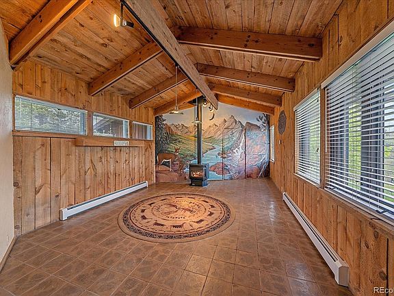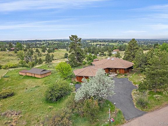 Welcome to a Santa Fe-inspired custom-built mountain ranch home, nestled in the coveted Ponderosa Hills neighborhood. This unique gem, crafted with character & love by the original builder-owner, exudes an artistic touch. Located just up the hill from downtown Parker, you'll enjoy easy access to its restaurants, shops, library, farmers market, rec centers, PACE Center & events such as Parker Days & the Christmas Carriage Parade. Yet, the home is far enough removed to offer the quiet & tranquility of horse property in the pines. Inside, exposed structural wood beams & the warm glow of natural wood tones evoke the feeling of a mountain retreat. The vaulted ceilings, skylights, and large windows frame stunning views of Pike's Peak and the evergreen landscape. The expansive great room features a king-size wood-burning fireplace and a cozy loft area adorned with artful paintings & built-ins. The charming kitchen includes a walk-in pantry & breakfast nook. The master bedroom offers a spacious walk-in closet & master bath with a custom copper-lined shower & stained glass accents. A blast from the past dark room for film developing can be more pantry storage or craft room. Horse enthusiasts will appreciate the zoning allowing horses & the property includes 2 barns and 3 fenced paddocks. Enjoy the benefits from paved county roads & an asphalt driveway, eliminating the hassle of gravel roads. The Spanish-style tile roof is not only aesthetically pleasing but also more hail-resistant, potentially reducing insurance costs. The home has new upgraded tankless water heater, high efficiency boiler, whole house water filter, garage door, 3 new Kohler toilets, & septic use permit is completed. Engineering drawings & blueprints for the home are avail. Douglas County Zoning is Estate Residential allowing for 1 horse per 1/2 acre. Being sold as part of an estate sale, this home may need some updating, but it presents a wonderful opportunity to own a distinctive and serene horse property
