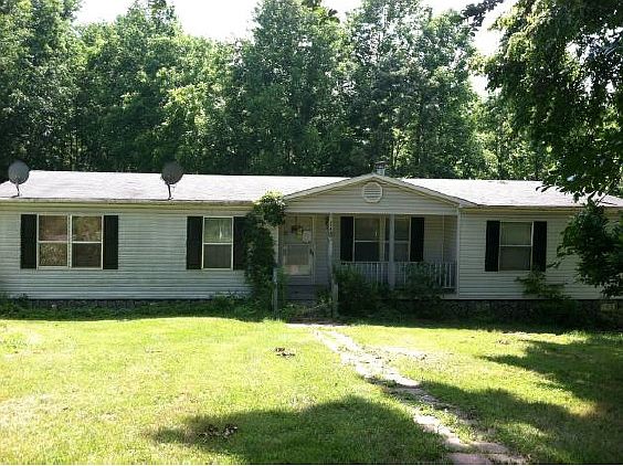Vinyl modular doublewide built in 1996 on two acres with 1420 finished square feet, three bedrooms, two baths, heat pump with central air, wood burning fireplace, eat-in kitchen, skylights, front covered porch, and rear wood deck.