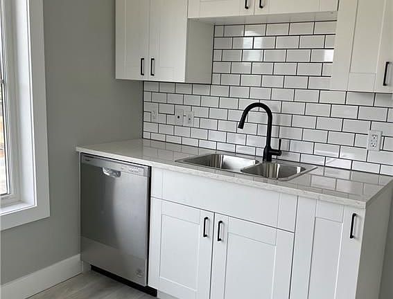 Private balconyWalk in closetModern white kitchenElegant black trimSubway tiled backsplashGranite countersLaundry hook-up
