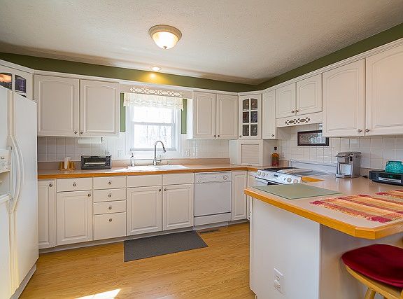 - Kitchen Cabinets/Counters: Formica Counter, White Cabinets