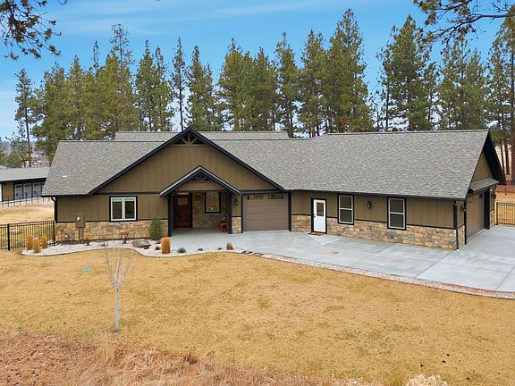Nestled among the pines, this nearly new, all main level home on 15 serene acres offers a private retreat accessed by its own private secluded paved driveway, all accessed through a gated community for added security. Every detail of the 3,100+ square feet of this residence has been thoughtfully designed. The great room features vaulted ceilings and real hardwood floors, creating a warm and open atmosphere. The kitchen showcases quartz countertops, a center island, walk-in pantry, and custom cabinetry. The home includes 3 bedrooms and 4 bathrooms. The owners suite is a private retreat complete with its own laundry, private sitting (office or bonus) room, and walk out access to the deck. The primary bath has a huge walk-in closet, dual vanities, a walk-in tile shower and heated tile floors. At the other end of the home you will find two bedrooms connected by a full jack-and-jill bathroom. The home is served by natural gas. Dual-zone heating and cooling include two furnaces and two air conditioners. A spacious three-car garage provides ample storage and features an additional bonus room or office with its own half-bath. Since purchasing the home, the seller added a finished outbuilding that could be used as an office, dog kennel, or home gym. The space is fully climate controlled and insulated, and equipped with water and electrical service.