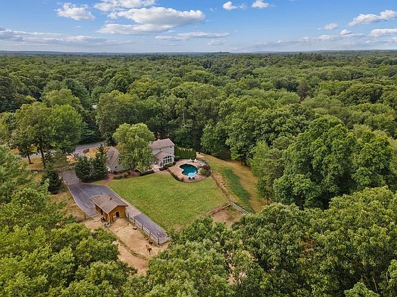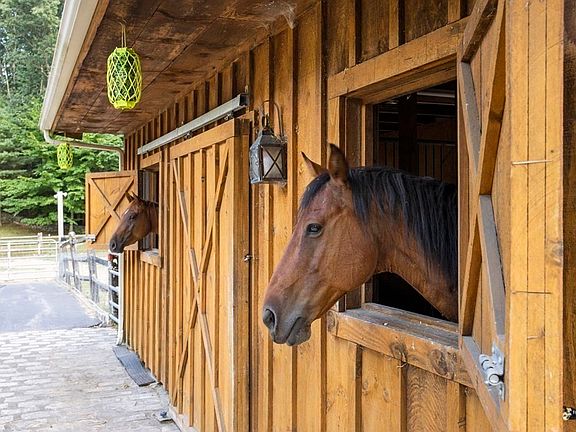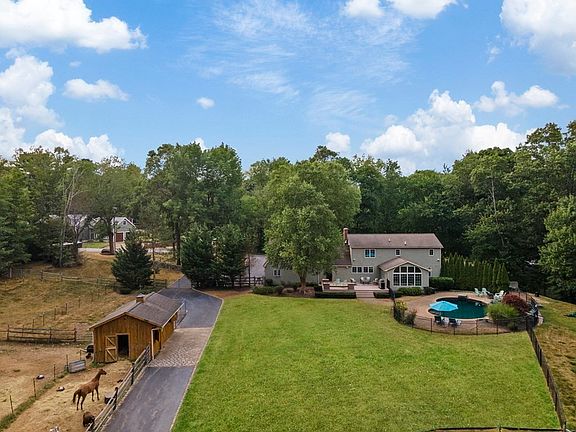 Beautifully Maintained Gentleman's Farm! Over-sized country cape equipped with a beautiful farmers porch and brick walkways, manicured park like grounds with lawn sprinklers and professional landscaping, & outlined with beautiful rebuilt stone walls. Featuring a two stall barn with run-in setup, fully equipped with electric (updated lighting and outlets) and two water hydrants, paddocks, and a separate run-in in shed. The back yard is an entertainers delight and features a deck off the house leading to the heated salt water, kidney shaped pool with fabulous waterfall and endless views of your horses grazing. The home has been completely renovated and updated with large open kitchen, expansive granite island, over-sized refrigerator/freezer, all stainless appliances. Open to the dining and newer family room area overlooking the pool thru floor to ceiling windows. Home is heated by hydro-air, electric is set up for generator, hot & cold running water in basement & garage, outdoor shower.