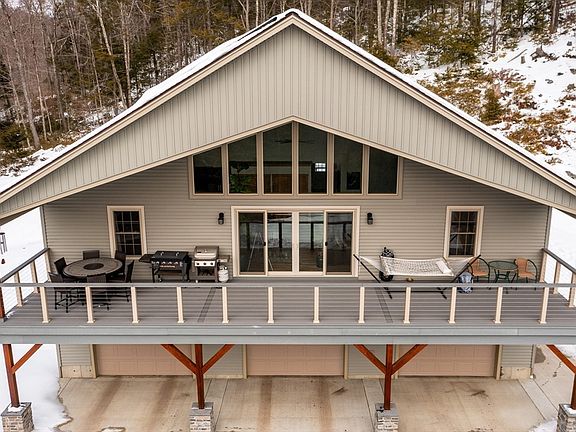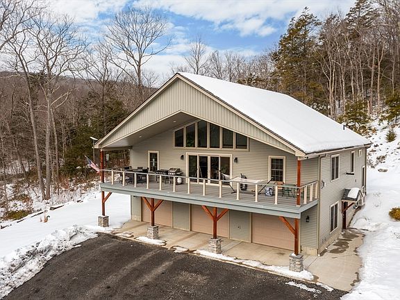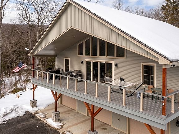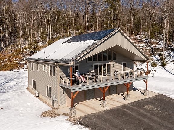 Modern A-frame with sweeping scenic views. This energy-efficient 3-bedroom home at the top of Burt Road is a light-lover's dream. Floor-to-ceiling windows overlooking the valley and an open floor plan. Main floor consists of living room with cathedral ceiling, fireplace and pellet stove, kitchen with stone countertops and open dining area, primary bedroom with en-suite and walk-in closet, laundry room and a second bedroom and full bathroom located off the hall. Lower level has an additional bedroom and full bathroom as well as a fourth room currently set-up as a gym. The 3-car garage includes an EV charger wired to each bay. Radiant heating (propane) and mini-splits for AC and supplemental heat. 8kw owned solar array. Starlight satellite for internet connection. 2x6 construction with R49 insulation. Abuts 100+ acres of land in Chapter 61A.
