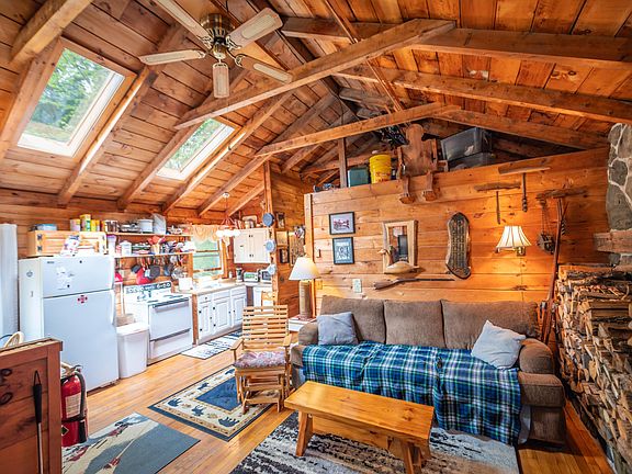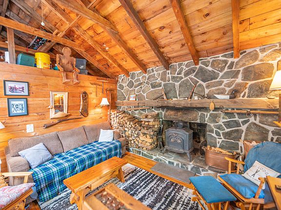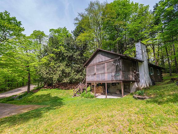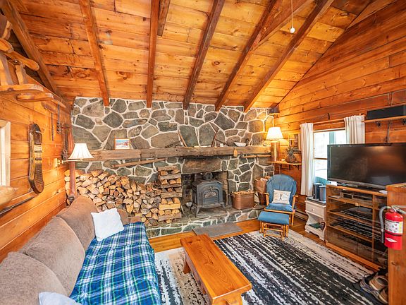 Lovely log cabin being sold by owners for the first time in 40 years. Nestled just down from Dover Hill, this cabin sits on a private parcel on a Vermont country road, just 10 minutes to the Mount Snow ski resort, and a short drive to lakes, the village of Wilmington, and Brattleboro. The lovely landscaped lot has mature trees and beautiful stone walls, as well as perennial gardens and lawn space. You enter via a large screened in porch, ideal for Vermont summer evenings. The inside features a large great room with vaulted ceilings, stone hearth with wood burning stove, great natural light with updated windows throughout, a galley style kitchen and dining area off the entry, one large bedroom and 2 guest bedrooms, all with vaulted ceilings, a full bath with window, a small loft area ideal for potential play space or overflow sleeping, and a stackable washer dryer. This makes for a perfect Vermont woodsy experience, without sacrificing the comforts of home. There is also a full basement perfect for off season storage. All at a very reasonable price as well!