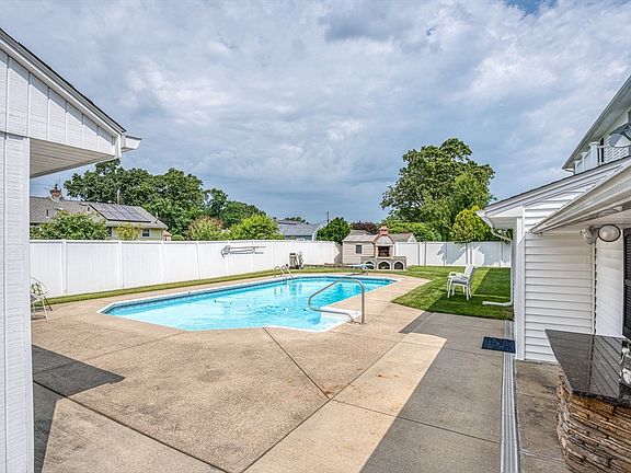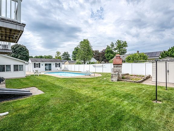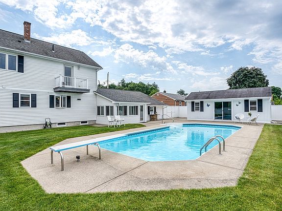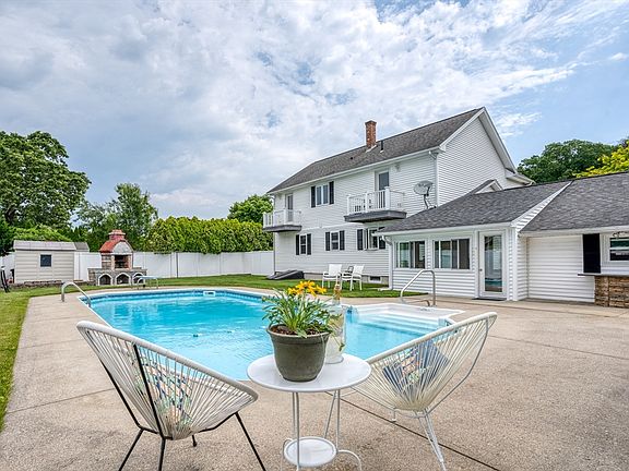 SEE THIS backyard RETREAT! 8 Rm Colonial offers an enclosed back yard w/beautiful Inground pool, large patios w/ BBQ area, Garden, Sheds, & 2 rm POOL HOUSE. 1st FLR offers: Bright GRANITE Kitchen w/Island/LR/DR OPEN FLOORPLAN (2009) along w/Home office, & large BR w/HUGE WALK IN CLOSET, gorgeous bath w/custom shower, heated TILE floor, & double size linen closet. 2nd FLR ADDITION (2006) offers 3 BRS, 2 w/balconies overlooking pool-perfect morning meditation spot! The Main Bedroom offers beautiful picture window, partial Catherdral ceiling, WALKIN CLOSET, & pocket dr entry to main bath-where you'll find a SOAKING TUB that welcomes serenity & peace! There's gleaming hardwd & TILE flrs, & SUN FILLED PORCH.The lower level offers multi purpose space: Rec rm w/wood/pellet stove FLUE, GYM/Craft Rm, 1/2 Bath, kitchen & Laundry area- perfect for family/IN LAW suite or Super Bowl watch party! There's also ample driveway for basketball & SS appls.All this & a super convenient area nr Ma Pike.