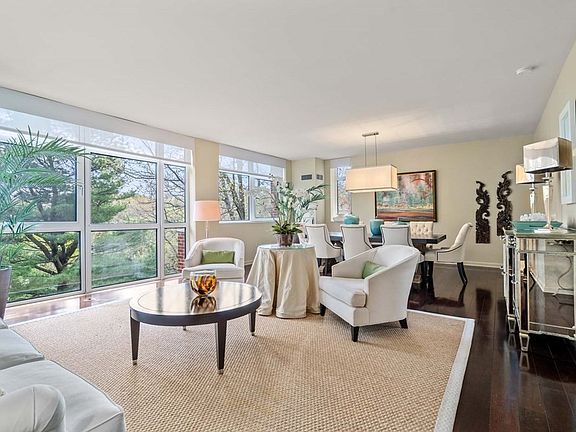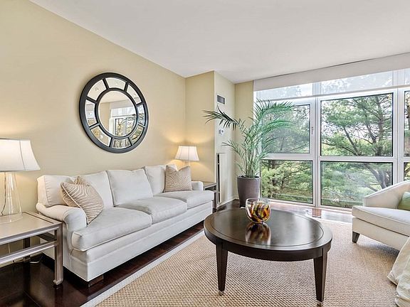 Overlooking a beautiful wooded area, this elegant two-bedroom, two-bathroom unit at Hampton Place offers a lovely open floor plan filled with abundant light. The main living area features a delightful eat-in kitchen, renovated in approximately 2007, with granite countertops and stainless steel appliances. There is a large combination living/dining room with high ceilings. The main bedroom is very spacious and has a large custom built out closet and a well-appointed bathroom with double sinks and a walk-in shower. The generously sized second bedroom has a walk-in closet and a full bathroom. There is a large laundry room. Hardwood floors throughout. Enjoy the wonderful amenities and services such as indoor and outdoor pools, clubhouse, gym, and concierge. The two-car tandem parking spaces in the garage are very close to the elevator. All in close proximity to "The Street," including restaurants, shops, and gyms