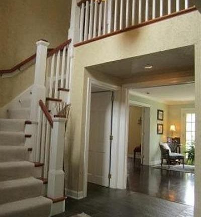 Stunning 4000 square feet w/over 1 acre, close to everything & has putting green. Lot is flat, wooded & private. Updated security system, paint & carpet. 1st fl features wood floors & recessed lights, 2 story Foyer w/slate floor, Library, Laundry, Den, LR w/built-ins & wood burning FP, eat in kit w/view & Viking stove. Rear slate patio has updated storm doors, lights & is wired for sound. Irrigation system & home warranty.