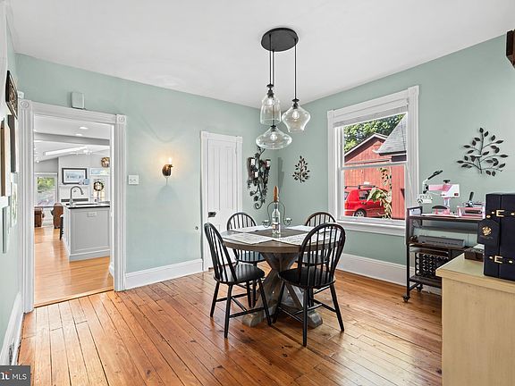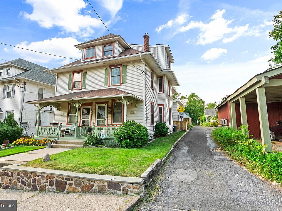 Welcome to 79 Hillside Avenue, a meticulously maintained 4-bedroom, 2.5-bath twin located in the heart of Doylestown Borough. Built in 1901 and thoughtfully updated, this home blends historic character with modern amenities, offering nearly 1,750 sq ft of living space across three finished levels. The main level features a traditional living and dining room layout that flows into a bright, expanded kitchen and family room addition. Skylights, vaulted ceilings, and a gas insert fireplace create a warm, inviting atmosphere, while Atrium doors open to a fenced backyard with patio and shed. The kitchen boasts modern cabinetry, honed granite countertops, and plenty of storage. Upstairs, three well-sized bedrooms share a full bath on the second level. The entire third floor is dedicated to the primary suite, complete with vaulted ceilings, skylights, a walk-in closet, and en-suite bath—providing a private retreat. Major system updates include conversion from oil to natural gas heating, replacement windows, central A/C, 200-amp electrical service, an updated water heater, and a newer roof (2012). The full basement provides laundry and storage space. A rare bonus for Borough living—there are two off-street parking spaces with alley access. Just a 7-minute walk to State and Main, this home places you close to restaurants, shops, schools, and cultural destinations. With its blend of history, updates, and prime location, 79 Hillside Ave offers an unmatched lifestyle opportunity