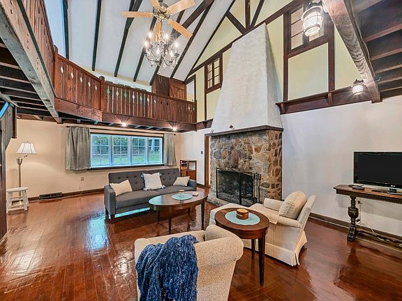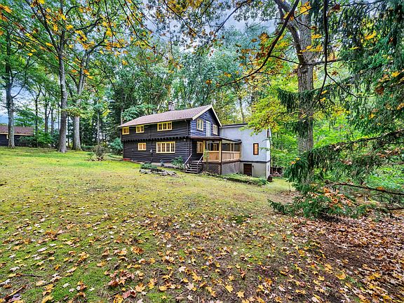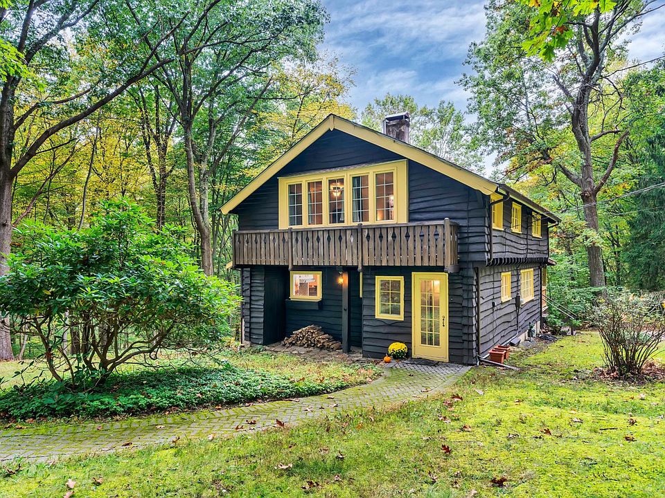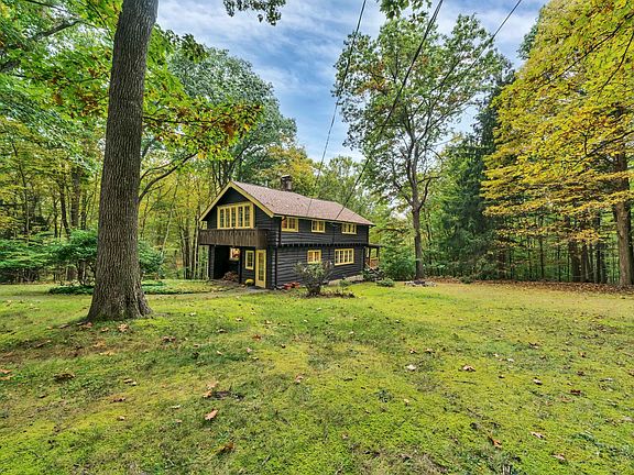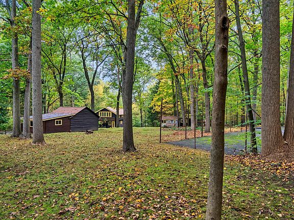 Swiss Chalet style home. Situated on 22 acres of woodlands. There is a stream, separate garage, 2 playhouses, etc..