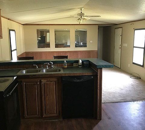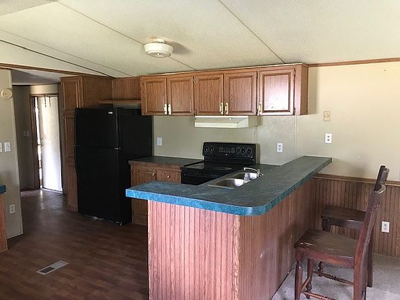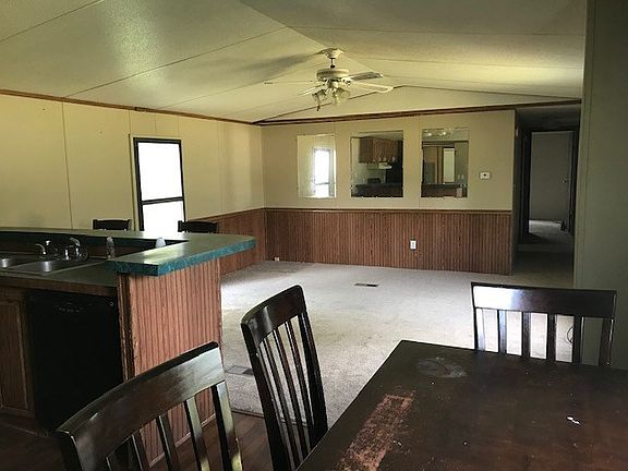 This 3 bed 2 bath single wide manufactured home is conveniently located right outside the city limits. Stay out of the rain with a double covered carport in the rear of the home. New carpet has been recently installed throughout. Kitchen is open to family room.