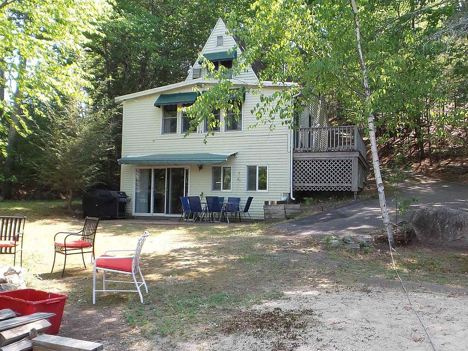 PAWTUCKAWAY WATERFRONT Just in time for summer!! You will fall in love with the sandy beach, lakeside sun deck and screen house at the water's edge! The outdoor space here is made for entertaining! Located in a no wake zone for ease of swimming and kayaking. This home is ready to move into today. Walk-out lower level contains the main living area, full bath, laundry and utilities. The second level has 2BR's and a half bath and the third floor is being used as more guest space and is fully finished, but does not have heat. Plenty of natural shade, 176 feet of water frontage and even comes with the pontoon boat! Don't hesitate or you may not get on the lake this summer! Agents please see non-public remarks regarding showings.