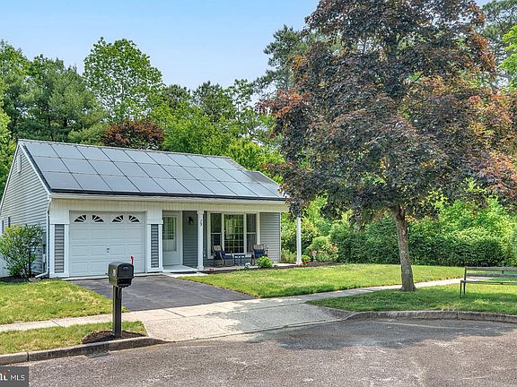 As you approach this 2 Bed, 2 Bath Ranch/Rambler home you cannot help but notice the serenity of this cul-de-sac lot surrounded by woods and beautifully landscaped gardens in this Senior 55+ community of Leisuretowne. This lovely Fairfax model is meticulously maintained and boasts many features; a covered front porch, remodeled kitchen with granite countertops (2019), custom island (2022), newer stainless steel appliances (2019), crown molding and luxury vinyl plank flooring throughout, updated bathrooms (2019), Safe-Step tub (2022), tankless hot water heater (2020), large lighted attic storage area over garage with powered lift and pull down stairs, Pella & Anderson windows and Minka-Aire ceiling fans throughout, ADT security system with camera and a backyard deck. A ramped entrance allowing ease of access into the home is only the beginning of several ageing-in-place amenities, which include wide doorways, a zero-entry shower and walk-in tub. Once inside the spacious living room you will notice the LVP flooring, Minka ceiling fan, crown molding and triple Pella double hung windows that highlight a wooded view. The Dining Room features three beautifully built-in custom cherry bookcases made in Lancaster Pa. Double Pella wood framed windows show a wooded view that brings calm and continues on through the kitchen window that captures morning sun. The kitchen, remodeled in 2019, offers beautiful soft close white Shaker cabinetry, two large pantries with lots of storage and pull-out drawers, granite countertops with island seating, newer stainless-steel appliances, a four-burner induction cook top with 1 min boil feature, contemporary range hood with a 30” curved glass canopy. The kitchen opens to the family room/den that serves as a multipurpose room for TV watching, office, exercise area and opens to the backyard deck with motion detector flood lights. 50 gallon rain barrels for rain harvesting sit on both sides of the home. Double doors open to the primary bedroom with remote shade, ceiling fan, Andersen windows and a stylish sliding barn door which opens to the primary bathroom and walk-in closet. The primary bath offers a newer vanity with granite countertop and soft-close doors/drawers. A zero-entry stall shower with river rock tile flooring enhances this space. The 2nd bedroom has a double wide closet and ceiling fan. The hall bath has a newer vanity and ceramic tile floor. Sit, relax and unwind in the Safe-Step walk- in micro bubble therapy tub (installed 2022). The laundry room has ample shelving, washer (2019) and dryer (2019) and entry door to the garage. The garage has an electric garage door opener, built-in wood shelving, pull-down stairs and a dumbwaiter style lift for moving items (200lbs) to the (32ft x 10ft) attic storage area with wood flooring. Did we mention that this home is equipped with a newer Solar System (2020). The Solar system is seller owned with a 25-year warranty from date put in service (04/20/2020). Warranty is transferable to new owners. Experience the enjoyment of all the Leisuretowne amenities; swimming pools, gym, community rooms, library, billiard tables, bocce, pickleball, shuffleboard courts, putting green, driving range, 50 different clubs, tennis courts and walking paths. Easy access to Rt 70, Rt 206 and Jersey shore points.