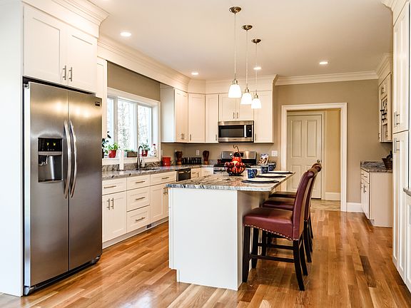 Enter this gorgeous 5 bedroom contemporary colonial, built in 2015, with four finished floors of living area, to discover the open plan filled with sunlight, ideally oriented toward nature views. Farmers porch welcomes you into two-level foyer with turned staircase, open to study and formal dining room. The modern floor plan features a sparkling white kitchen with granite island and counters, pretty pendants, stainless appliances, and huge windows with southern exposure. Open dining area and living room with gas fireplace opens to an expansive deck overlooking large private yard. Upstairs find four generous bedrooms, tiled baths, laundry room and private Master Suite, with double walk-in closets, cathedral ceiling, and elegant bathroom with soothing stonework, jacuzzi, glass shower, and double vanity. Expansive 3rd level has hardwoods and large skylights, plus a 5th bedroom with gleaming bathroom and tiled shower. Finished basement has big windows and walks out to peaceful, level lot.