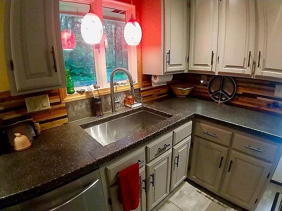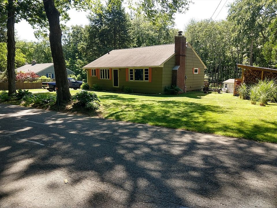 Well-maintained, 3 bedroom, 2 bath ranch on a 1/2-acre , 2.5 miles to both downtown Easthampton & Northampton. Hardwood & ceramic tile floors. Recently updated kitchen featuring custom concrete countertops and backsplash, stainless steel appliances and oversized sink. Good-sized living room. Master bedroom with canopied balcony. The lower level includes a nicely finished bonus space featuring a custom concrete, 5-seat/6-tap bar, pellet stove, reclaimed wood features and beautiful full bath. Workshop with large work bench and a separate laundry/utility room. Walk-up attic for storage. Private backyard with raspberry trellis, fire pit, established landscaping and 3 storage sheds plus dry storage under balcony. On the PVTA bus route & located just 585 ft from the Rocky Hill Greenway boasting over 100 acres, miles of hiking trails, access to bike path & Arcadia Wildlife Sanctuary (750 acres) funding in place for a bike path extension 1/3 mile from the home Deadline for offers May 6 @ noon.