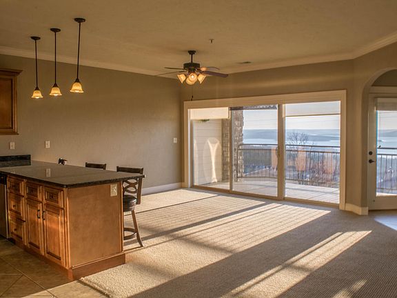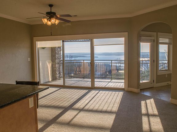 Private end unit including GARAGE! 180 degree TABLE ROCK LAKE VIEW from living room, kitchen, dining room, sunroom and deck. Spacious condo with 16x10 ft sunroom. Wall of windows with sunshades and blinds to VIEW!! Watch the Branson Belle go by and see the Chateau Hotel from patio/deck. Luxury living at Branson's premier condo location with gated entry and beautiful Clubhouse including 24/7 exercise room, pool and kitchen/community room for entertaining. Oversized single car garage included! Quality construction includes fireplace, stainless appls, granite counters, crown molding, Italian stone floors, jacuzzi tub, walk-in closets, & much more! Elevator to condo so no stairs! Perfect as second home or primary residence. No nightly rental allowed.