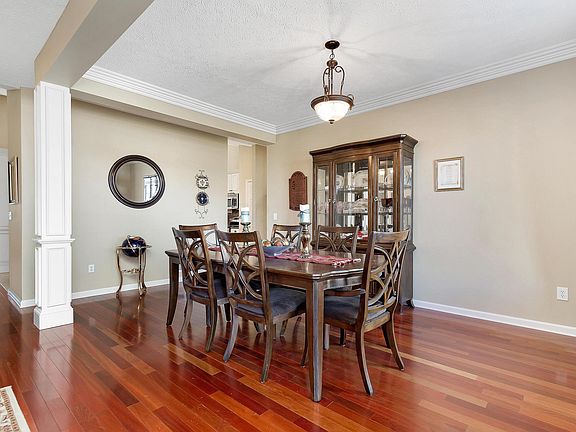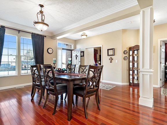 A hard to find 4 BR 2 BA ranch, exquisite quality. Open great room/formal dining room/eat-in kitchen has columns w/ dramatic vaulted ceiling. Brazilian Cherry hdwd floors. Gas fireplace w/ attractive mantle. Crown molding. Huge gourmet kitchen remodeled 2013 sparkling stainless steel newer appliances, white oversized tall cabinets with under cabinet lighting, quartz countertops Master has vaulted ceiling, hardwood floors, customized master walk-in closet with wood shelves! Master Bath has walk in shower, glass block window, glass doors, adjustable shower head and three body sprays. Master Bath has two attractive bowl sinks, bronze fixtures, matching lighting. Basement has poured walls. . Custom built tool shed. Washer and dryer stay with home.