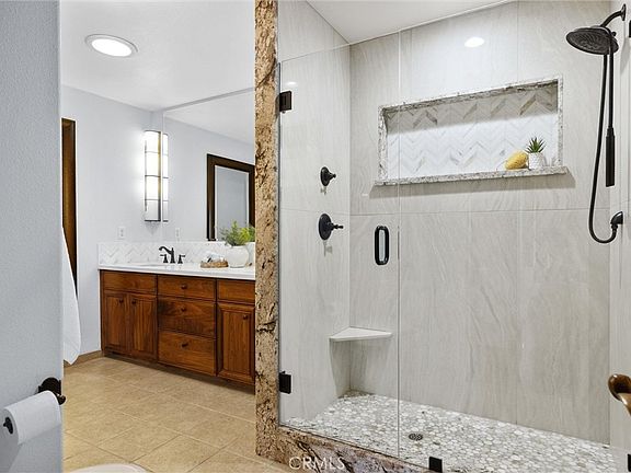 The upstairs bathroom has been upgraded with a spacious step-in shower featuring a smooth pebble floor, modern glass front, and beautiful granite surround. A large beveled mirror with updated light fixtures complements the area above the dual-sink vanity, which is accented by a decorative herringbone backsplash.
