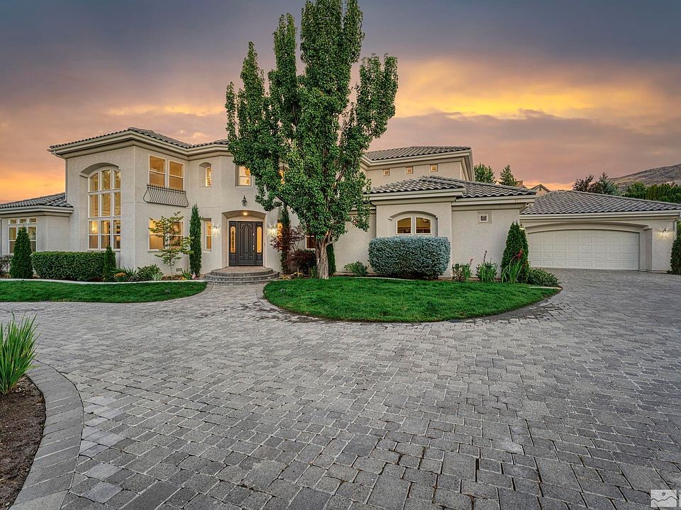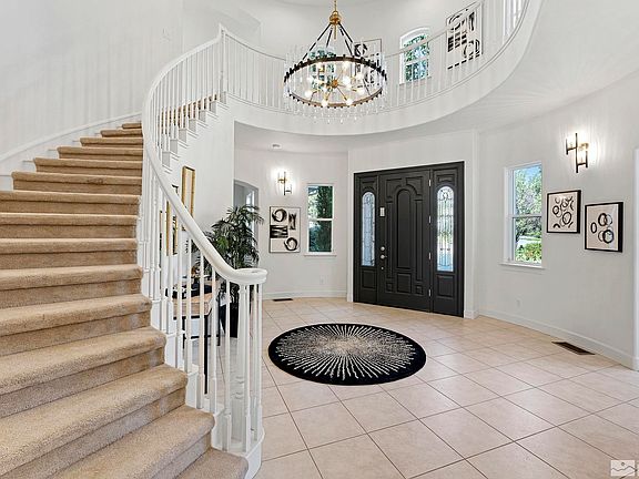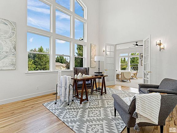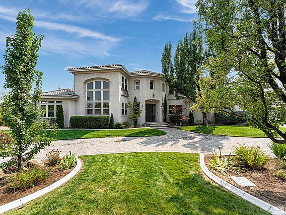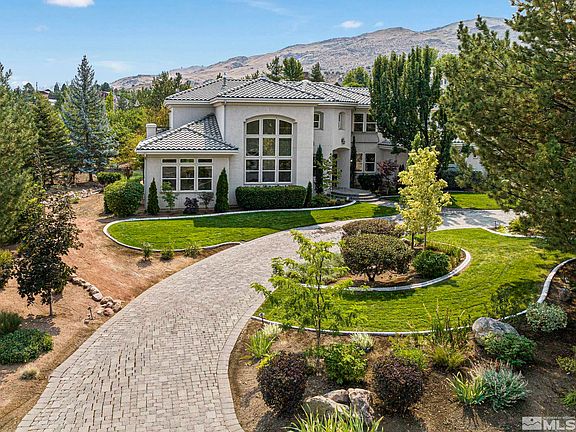This incredible 5 bedroom, 4.5 bath home is nestled on a large one-acre lot in the prestigious Juniper Estates neighborhood of West Reno. The curb appeal is high with this home, with freshly manicured landscaping and a circular paver driveway. Enter the foyer to an elegant circular staircase and vaulted ceilings. Just off the foyer is a sitting room/office, with a 2 story wall of windows that makes an impression from both inside and outside of the home., A family room with a wet bar and beverage fridge is a great place to entertain guests and can be closed off with glass french doors. The living room is light and airy with lots of windows showcasing the backyard view, and bookshelves flanking a gas fireplace centerpiece. The kitchen offers plenty of cabinets and counter space, with a large center island and high-end stainless steel appliances, an oversized refrigerator, a breakfast nook, and a separate workstation/desk area. Just off the kitchen is a formal dining room suitable for larger gatherings. A bedroom on the main level features its own bathroom and an entrance to the backyard. Upstairs the primary suite has a gas fireplace, a balcony with downtown views, an extra large walk-in closet, and a bathroom with dual vanities, a large tub, and a stand-up shower. Additional upstairs bedrooms are large with lighted ceiling fans and beautiful neighborhood views. The interior of the home has been freshly painted and the wood floors have been re-finished, and several new lighting fixtures can be found throughout the home. The oversized garage offers plenty of room for storage or extra vehicles. Outside the backyard has been completely redesigned, with a back patio, new terraced landscaping, and a raised bed garden. This gorgeous home truly must be seen to be appreciated!