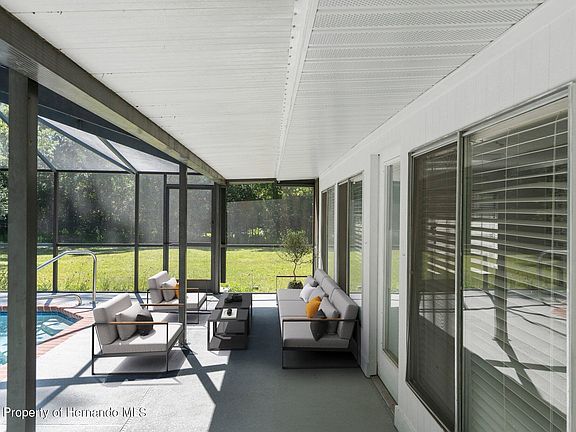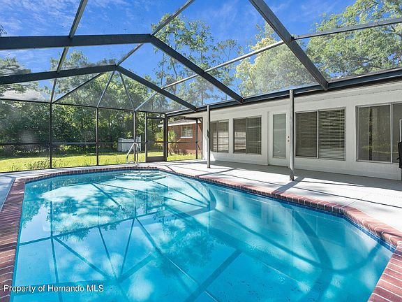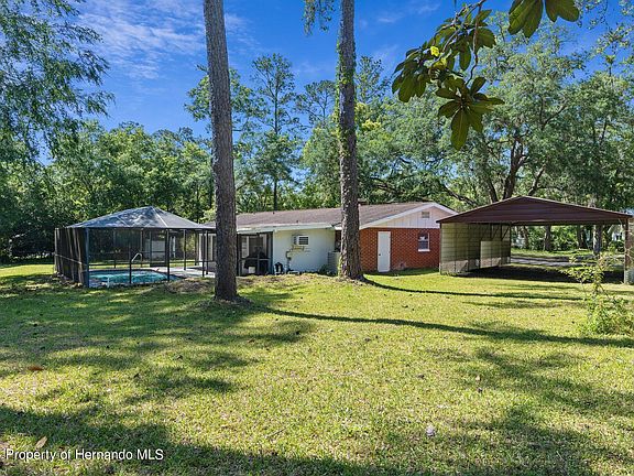 A LITTLE BIT COUNTRY .. & Yet Only Minutes Away from Downtown Brooksville! .92 of An Acre with a Majestic Oak Tree in the Front Yard. This Brick Home has 3 Bedrooms, 3 Bathrooms, 2 Car Garage, 4 Car Carport (could be used to store toys like a boat) AND a Screened Enclosed Resurfaced Pool with Partially Covered Deck and New Concrete Acrylic Coating on the Lanai. Home is Newly Painted with New Luxury Vinyl Flooring and Newer Carpet in the Bedrooms. Living Room offers a cozy Fireplace. Kitchen has White Cabinets, Quartz Counters & Stainless Steel Appliances. Master Bedroom Suite offers a Walk in Closet & Private Updated Bathroom. Another Bedroom is also an ensuite.. Perfect for extended family, the snoring spouse or a teenager needing their own bathroom. Inside Utility Room. Plus in the Back of the home has a 27 x 13 Sunroom which would be my Favorite Room. Off of this room is a small room perfect for an Office or a Large closet. Floorplan is in the photos.. with Virtually Staged Rooms so you can get an idea of what this home could look like furnished. 2012 Three Dimensional Roof with 2023 Front Gutters. Public Water & Sewer. Call to See this Adorable Home!